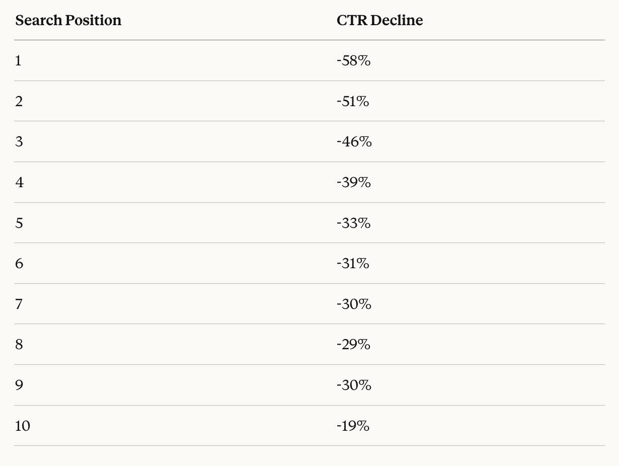 According to updated Ahrefs data from late 2025, when an AI answer appears in search results, the click-through rate for the first organic position drops by 58%. Looking at the global market, informational sites lost between 15% and 60% of organic traffic in 2025, depending on their niche.