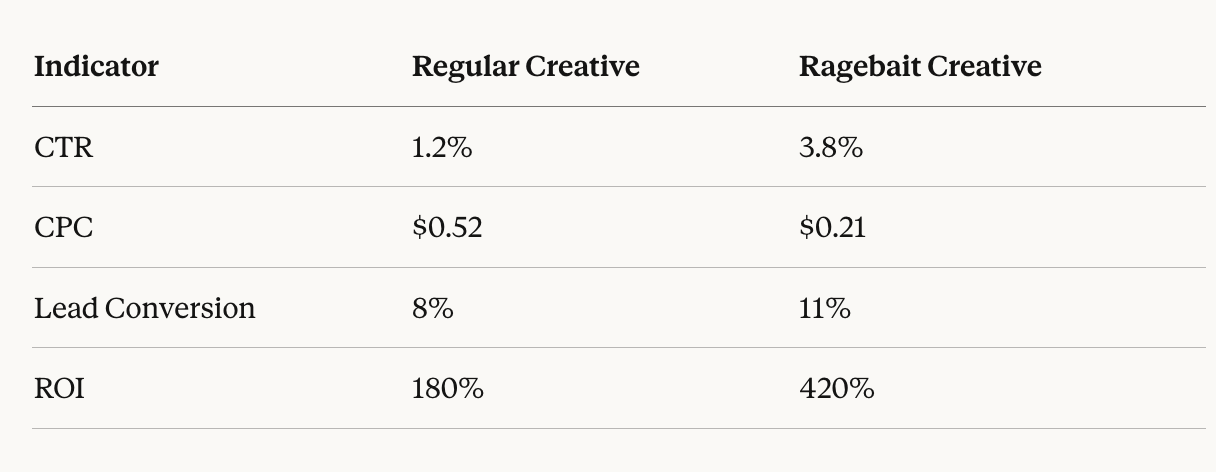 - Launch A/B test: classic vs. ragebait creative
